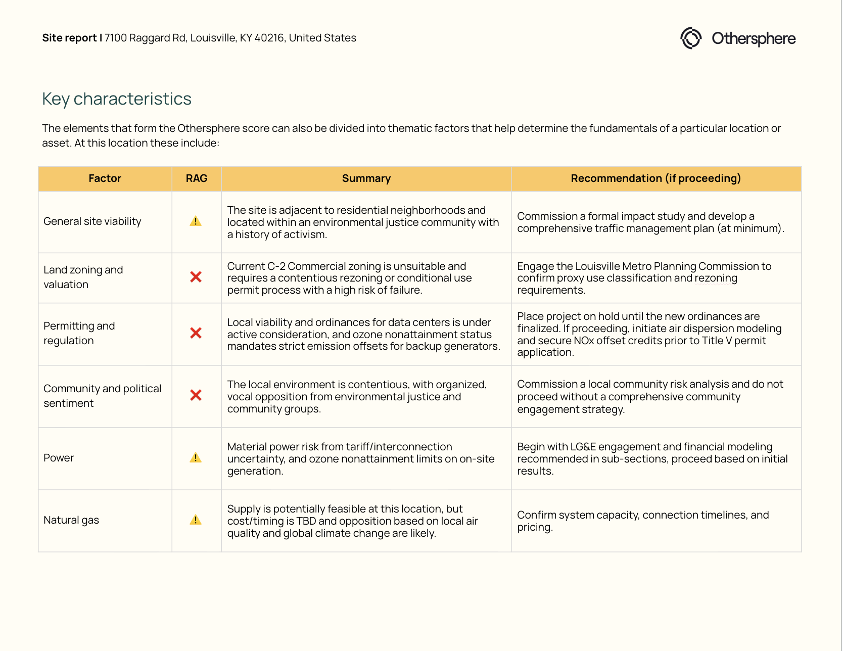 Review details on known sites, or search based on location-specific characteristics and scores. Aggregate results to vet regions or company portfolios.